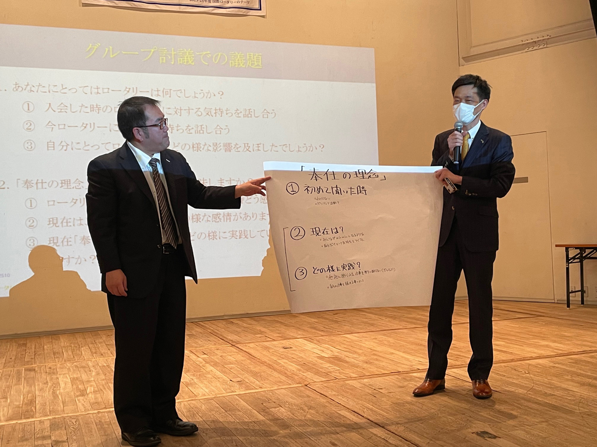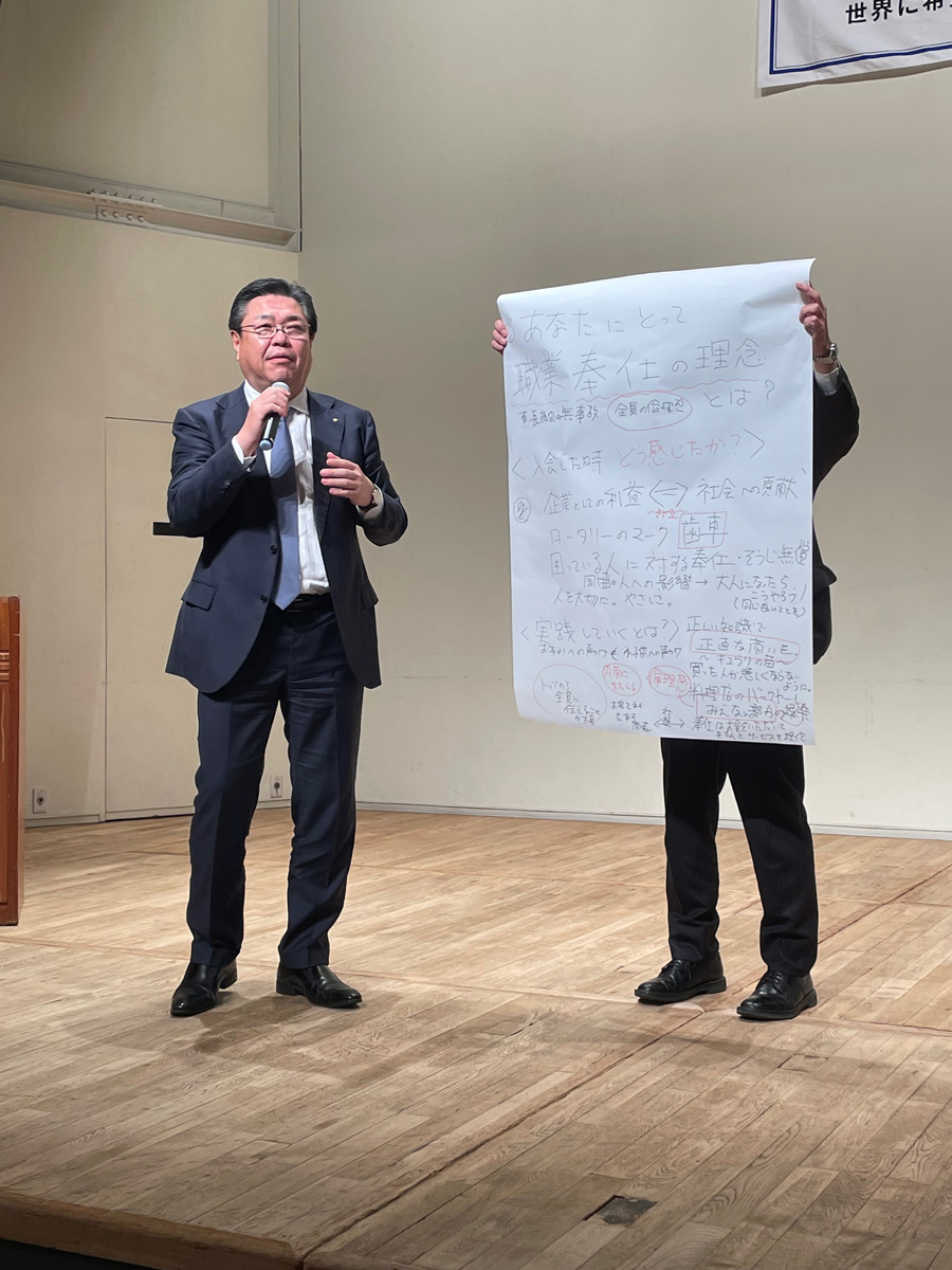 6月6日RI第2510地区職業奉仕委員会の長田委員長をお迎えして職業奉仕例会を金森ホールにて開催いたしました。長田委員長によるロータリークラブにおける職業奉仕について講話をいただき、その後グループに分かれてのディスカッションを行いました。最後に各グループから発表をし職業奉仕の理解が深まった一日となりました。長田委員長ありがとうございました。